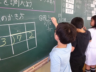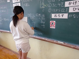 算数の学習では、わり算の筆算の仕方について考え、大きい位から計算することやたてる、かける、ひく、おろすの順で計算することなどを練習問題を解いて確かめました。