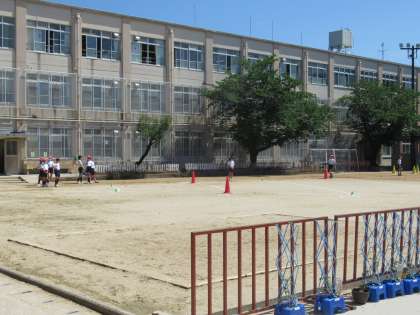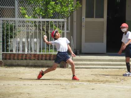 体力測定をした火曜は、前日の雨もあがり、気持ちのよい晴天でした。工事が終わって広くなった運動場では、ソフトボール投げの記録を測定しました。