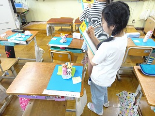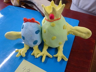 図工「元気のおまもり」の学習では完成した作品について振り返り、友だちの作品を見合いました。それぞれの思いを込めて創り上げた作品を見合うことで、友だちの作品のよさに気づくことができました。
