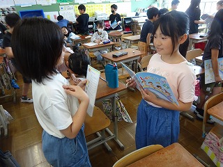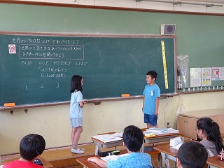 子どもたち同士でデモンストレーションをしたり、繰り返し英語表現を声に出して確かめたりして、ペアでのやり取りを楽しんで自分の考えを伝え合うことができました。