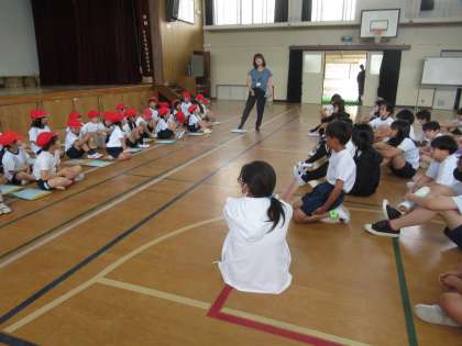 体力テストが終わった後には、体育館で「かもつれっしゃ」のゲームをしました。6年生のやさしい表情と1年生のうれしそうな表情が印象的でした。