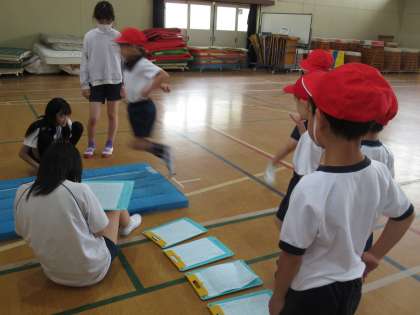 体育館にマットを敷いて場づくりをした後、立ち幅跳びの見本を示したり、1年生が練習したときにアドバイスをしたりしました。練習後のテストでは、巻き尺を使って記録を測定し、1年生の記録用紙に記録をしました。