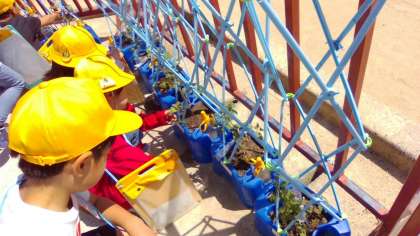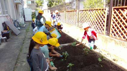 ミニトマトには毎日自分で水やりをしてぐんぐん成長しています。学校の畑ではいろいろな野菜を育てています。水やり当番を決めてみんなで育てています。
