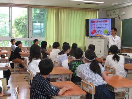 下京警察署の方をゲストティーチャーにお迎えして、「社会のルール教室 〜心にブレーキ〜」を実施していただきました。写真やスライドなどの資料を用いて、暴力・万引きなどが犯罪になることや、薬物の恐ろしさなどについてお話していただきました。また、学校や家庭でのきまり・ルールをしっかりと守ることが、自分自身や自分の大切なまわりの人のためになることも教わりました。