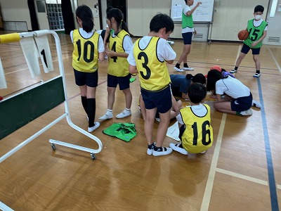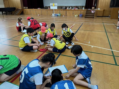 バスケットボールの学習では、ねらい2「シュートにつながるようなすばやくタイミングのよい動きや作戦を工夫しながら、相手チームに挑戦して楽しむ。」の活動に入っています。チームで作戦や意識することを話し合って決めています。どんどんレベルアップしています。