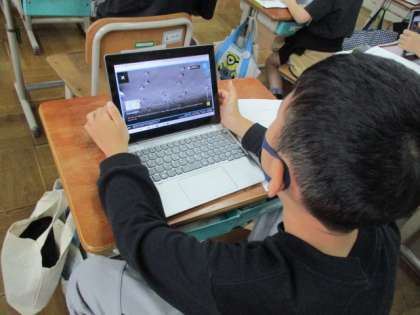 理科「チョウを育てよう」の学習では、モンシロチョウの卵から幼虫、さなぎと観察を続けてきました。成虫は動きも早く、観察が難しいのでGIGA端末上の図鑑で調べました。顕微鏡モードなど、かなり詳しく見ることができ、楽しみながら観察できました。