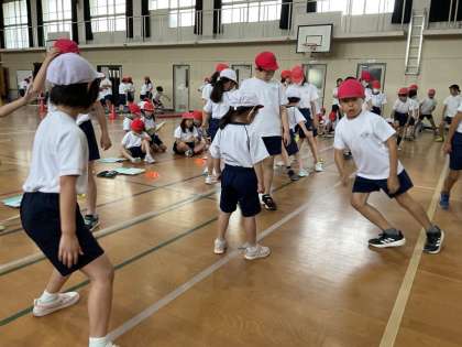 体育の学習で新体力テスト「反復横跳び」「立ち幅跳び」を行いました。5年生のお兄さん、お姉さんたちに跳び方を教わったり、飛距離を計測してもらったりしました。