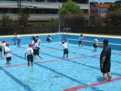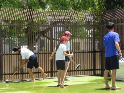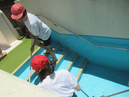 4校時から6校時にかけて1クラスずつ掃除をしました。デッキブラシでプールの底や腰洗い槽の汚れを落としたり、ほうきを使ってプールサイドの落ち葉をきれいに掃いたりしました。3クラスが掃除を終えたときには、泥だらけだったプールの底が、きれいな水色になっていました。