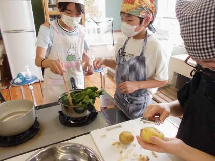 家庭科の学習で、初めての調理実習を行いました。ほうれん草のおひたしと、ゆでいもを作りました。グループで協力して役割分担をして活動しました。