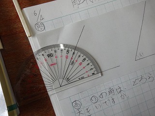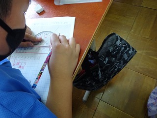 算数「角とその大きさ」の学習では、分度器の使い方を知り、分度器で角の大きさを測りました。初めて使うため正しく読み取ることに苦労している様子がみられましたが、少しずつ慣れ、分度器と三角定規を使って角の大きさを正確に調べられるようにしていきます。