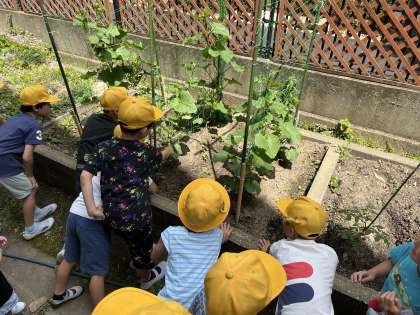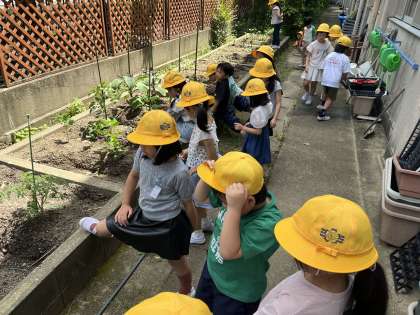 2年生のみんなで育てている野菜が、ぐんぐん成長しています。子どもたちは、葉が大きくなったこと、色が変わったこと、花が咲いたことなど、たくさんの発見に目を輝かせていました。