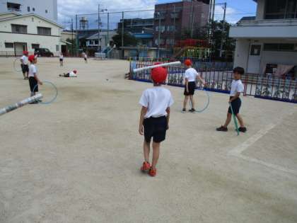 体育科では、「ようぐあそび」の学習を進めています。棒やボールやフラフープを使って、遊びを作る活動では、フープにボールを入れたり、棒でボールを運んだりしています。それぞれのグループで楽しそうな遊びを考えて取り組んでいます!