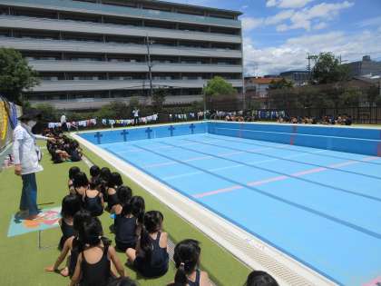 今日は、もしものときのためのプールから運動場への避難の仕方も練習しました。
