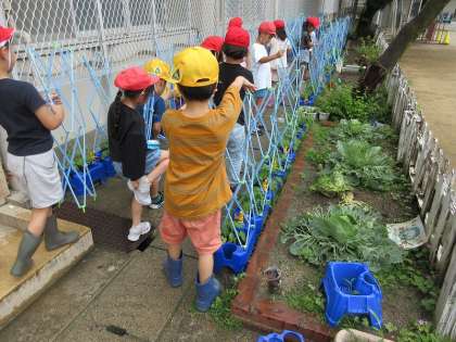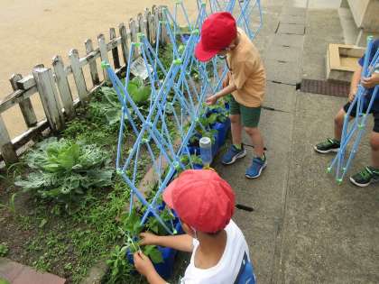 5月に種をまいたアサガオは芽を出したあと、ぐんぐん成長しています。