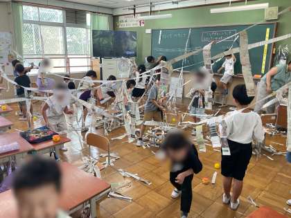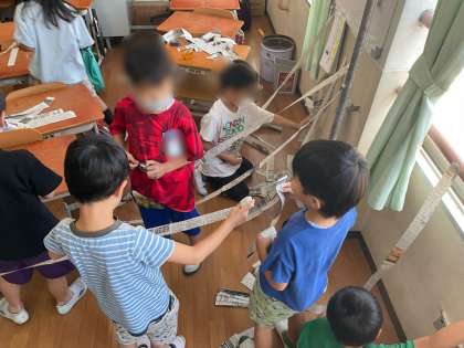 図工科「つないでつるして」の学習を行いました。教室全体を使って、細く切った新聞紙を自分たちの思いに合わせて紙を繋げました。友だちと協力して、2時間楽しく取り組むことができました。