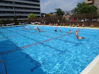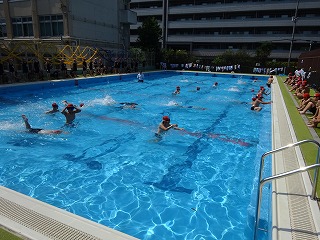 水泳の学習のきまりや水慣れの他、いざという時に備えて避難の訓練も行いました。最後は今年の水泳運動の目標を明確にするために今どれくらい泳げるのかを確かめました。
