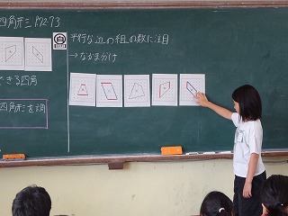 平行な辺に目を向けて、四角形を動かしながら、向かい合う1組の辺が平行な四角形と向かい合う2組の辺がどちらも平行になっている四角形、どちらにもあてはまらない四角形の3つに仲間分けして確かめることができました。分け方の理由を大切にしながら、話し合うことができました。