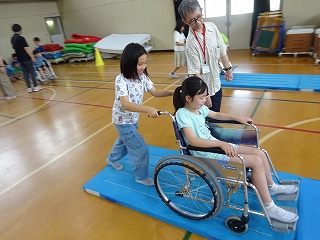 車いす体験に乗ることも押すことも初めてという子がほとんどで体験を通して、様々な気付きがありました。