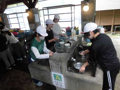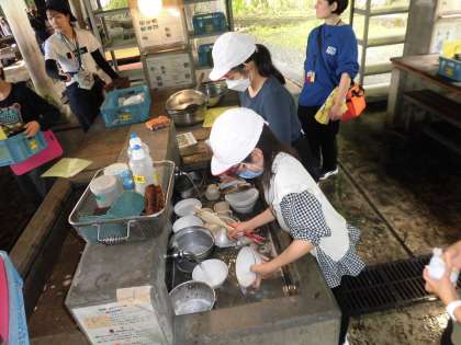 花背山の家での最後の活動、野外炊事が始まりました。まずは、薪をくべたり、調理器具を洗うところからスタートです。さあ、最後には、おいしく鶏すきができるでしょうか。みんな、とても楽しそうです。