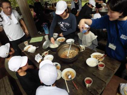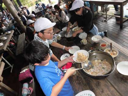 みんなで協力して鶏すき焼きが完成しました。「おいしい。」「最高。」と笑顔の花が咲き乱れています。途中、火が弱くなったり、一か所にかたよったりと、四苦八苦しながらも調整して、ようやくできあがり。きっと「友情・協力」という特別なかくし味が入っているから最高の料理になったんでしょうね。すばらしいチームワークでした。