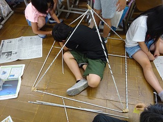 図工「つなぐんぐん」の学習では、新聞紙の棒をつないでできそうなことを話し合い、グループで協力して、作品づくりをしました。