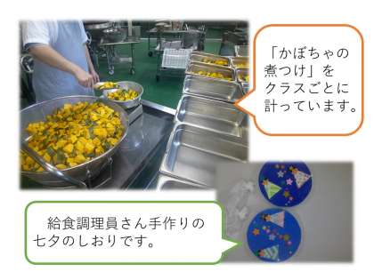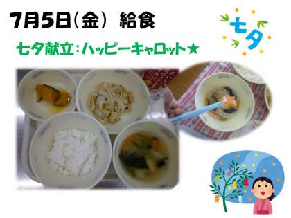 7月5日(金)の給食は、ごはん・きつね丼の具・かぼちゃの煮つけ・七夕そうめんの「七夕献立」でした。七夕そうめんに、星型のにんじんを入れてハッピーキャロットを実施しました。星型のにんじんが当たった児童には、調理員さん手作りのしおりをプレゼントしました。うまみたっぷりのだし汁は味わい深く、つるっとしたそうめんは、子どもたちに人気でした。季節の行事を感じて給食を楽しんでほしいです。