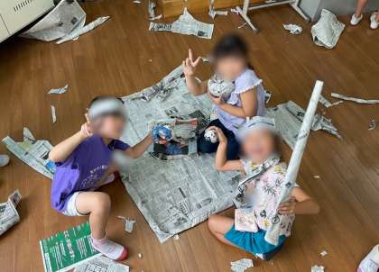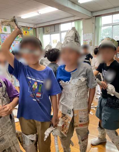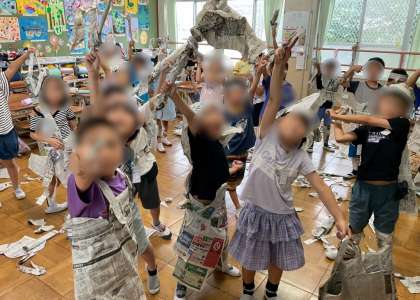 図画工作科「新聞紙となかよし」の学習では、新聞紙をちぎったり、繋げたりすることでエプロンを作ったり、かぶとや帽子を作ったりすることができました。中には家づくりに挑戦する子どももいました。新聞紙と楽しい時間を過ごすことができました。