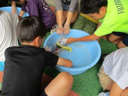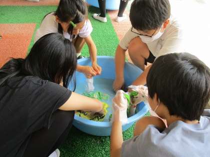 つまみ洗いやもみ洗いをして汚れを落としている子