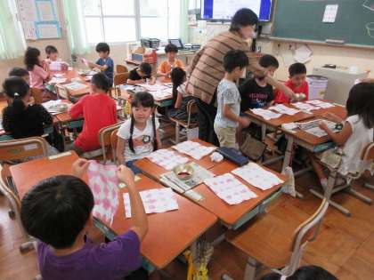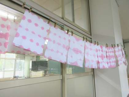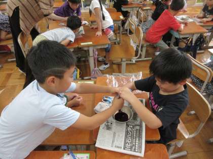 夏休みに咲いたアサガオの花から色水を絞り出して、和紙に染みこませて遊びました。