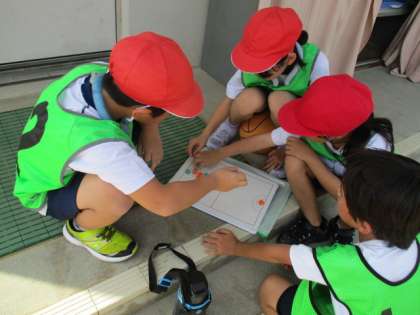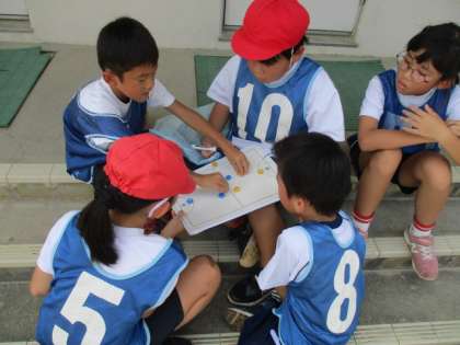 今日は途中から暑さが厳しくなったので、試合を中断して、日陰で作戦会議をしました。作戦ボードを使って、「前に動いたらいいんじゃない?」「こっちに相手が来たら斜めにパスしよう!」など、具体的な作戦が聞こえてきました。楽しみながらも、よく考えて活動できています!