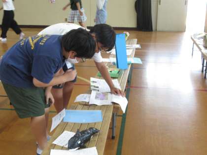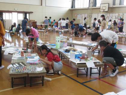 5日の木曜に、自由研究作品展を見に体育館へ行きました。体育館の中は、全校児童の個性あふれる作品がずらりと並んでいました。同じ学年の友達の研究作品をじっくりと読んだり、他学年の工作などの展示物を見て楽しんだりしながら、友だちと感想を伝え合う姿が見られました。