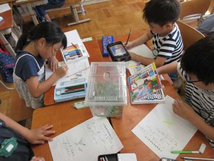 生き物探しから帰ったあとは、見つけた生き物たちと仲良くなるために、まずはじっくりと観察しました。