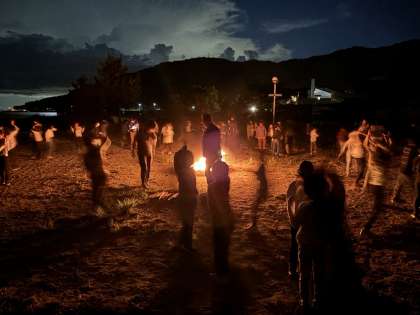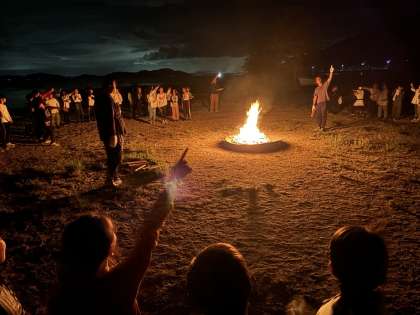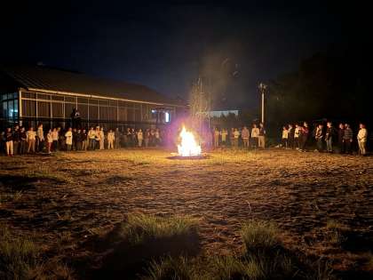本日最後のプログラムは、キャンプファイヤーです。琵琶湖の南の方では雷が光っていたり、京都市内では雨が降っていたりしたようですが、こちらはみんなの元気で雨も降らず、大いに盛り上がりました!!