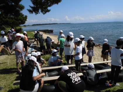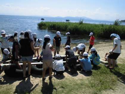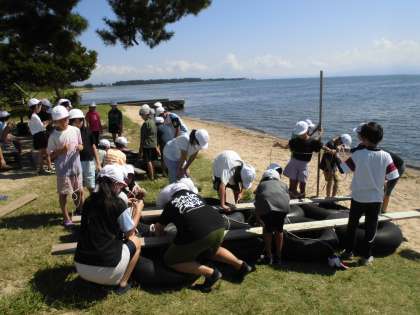 8個のタイヤチューブを合体させたら、板を結んでいきます。少しづつ『いかだ』の形になってきました!「ここ抑えておくから、引っ張って!」「板持ってくるわ。」と自然に協力する声が聞こえてきます。