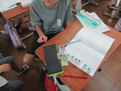 算数科「あまりのあるわり算」の学習では、あまりの処理の仕方について学習しています。数図ブロックを使ったり図に書いたりして、自分の考えをまとめるのを頑張っています。また、ペアの友達にも、その図をもとに一生懸命説明する姿が素敵です!