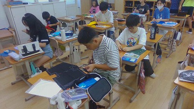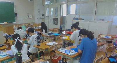 家庭科の学習では、お弁当バッグを作っています。布を裁ち、しつけぬいをしました。5年生で学習したことを生かして頑張っています。