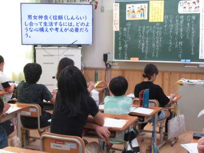 クラスの女子と仲がよいことから、クラスの友達から冷やかされていた主人公の一郎。すみ子の堂々とした態度や自分にあてた「言葉のおくりもの」をきっかけに、一郎やクラスのみんなが、どのような思いになったのかについて話し合うことで、男女仲よく信頼し合って生活するうえで大切なことについて考えました。