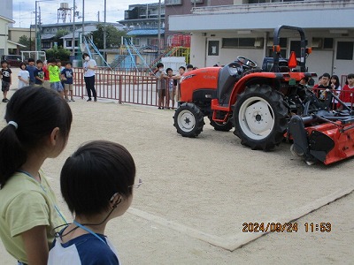 3年生は農業で使う本物のトラクターを見せてもらいました。「とても大きかったよ!」とさくらの教室で教えてくれました。