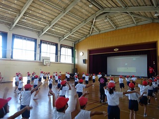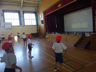 10月のスポーツ大会に向けて団体演技の練習を進めています。動画を見ながら、動きやタイミングを確かめながら見よう見まねで練習をする子どもたち。