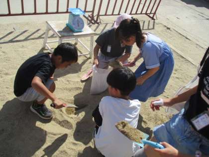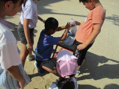 算数科「重さ」の学習では、gやkgの単位を学習してきました。今日は、砂場で1kgをつくる活動をしました。思っているより1kgが重いことに驚いている様子も見られました。1kgの量感を、これからの生活に生かしてほしいと思います。