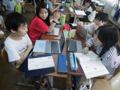 よいあいさつの例と悪いあいさつの例を動画にしてみんなにみてもらったらいいのではないか。あいさつをたのしくするために、じゃんけんやハイタッチを取り入れればよいのではないか。などと、グループごとにできることをまとめていきました。また、班で決まったことを実践するために動画やポスターなどを作成しました。