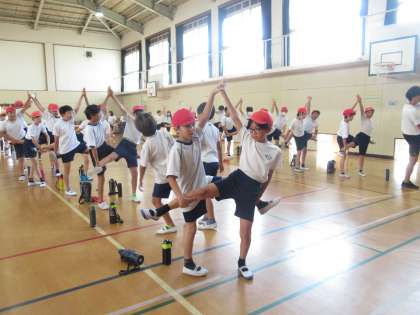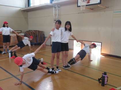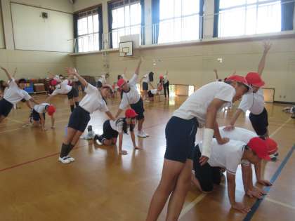 体ほぐし運動では、音楽に合わせて一人技・二人技などに挑戦します。動画を見ながら休みの日におうちで練習をしてきた子もいて、とてもうれしく思いました。