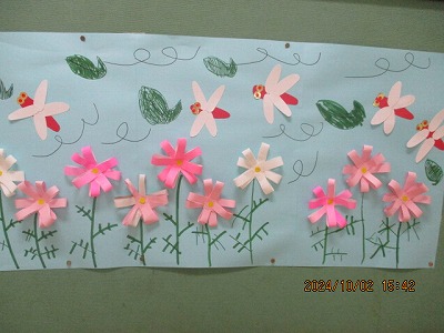 10月の季節のかざりを作りました。折り紙のテープを使って作ったコスモスに、画用紙と丸形のシールで作った赤とんぼを飛ばしました。完成したかざりを見ながら、秋風を感じられる季節になったなあと感じるひとときでした。