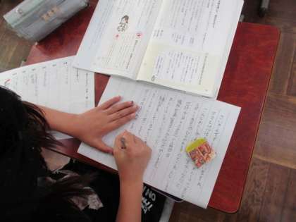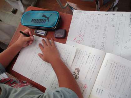 国語科では『気持ちをこめて「来てください」』の学習では、相手に分かりやすいように案内を書く学習をしています。再来週にスポーツ大会があるので、その招待状を書いています。今日は、メモをもとに下書きを書きました。教科書の見本をよく見て書くことができました。