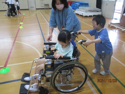 3年生は総合的な学習の時間の取り組みの一環として、車いす体験をしました。車いすに乗る側、車いすを押す側、どちらも体験しました。乗るまでにブレーキをはずしたり、足の乗せるステップを用意したり、乗るだけではない体験ができたことがとても新鮮でした。
