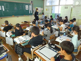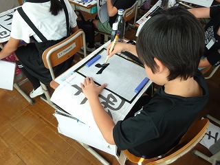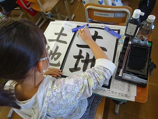 書写では、「へん」と「つくり」の組み立て方に気を付けて、お手本を見て、「土地」の2文字を書きました。繰り返し練習をしてポイントを確かめながら字形を整えて書くことができました。