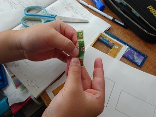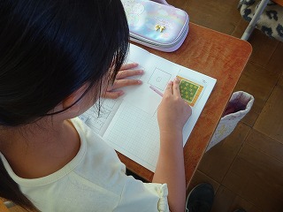 算数では面積の学習を始めました。広さを比べるために、形を重ねたり、切ったり、ますの数で比べたりして、どちらが広いかを確かめました。