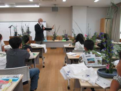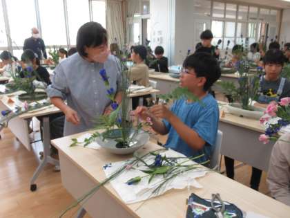 22日(火)に、「ようこそアーティスト事業」の華道体験をしました。日下部流の日下部一如先生をお招きして、生け花で使うはさみの使い方や花の生け方など基本的なことを教わってから、花器に花を生けました。