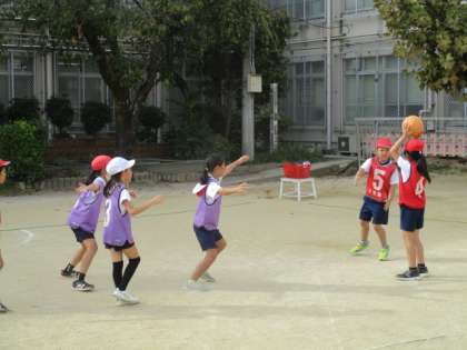 体育科では、「バスケットボール」の学習が進んでいます。どのクラスも、対抗戦に入りました。対抗戦は、同じ2チームと続けて2試合します。1試合目を振り返り、2試合目で勝つためにどのチームも作戦を立てたり、練習をしたりしてがんばっています。