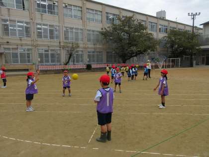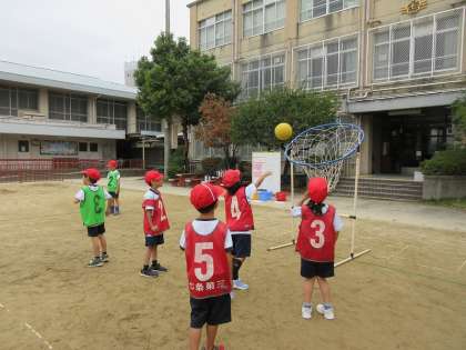 この学習は4年生以降の「バスケットボール」の学習につながるもので、用具やコートづくりなど準備からみんなで行います。